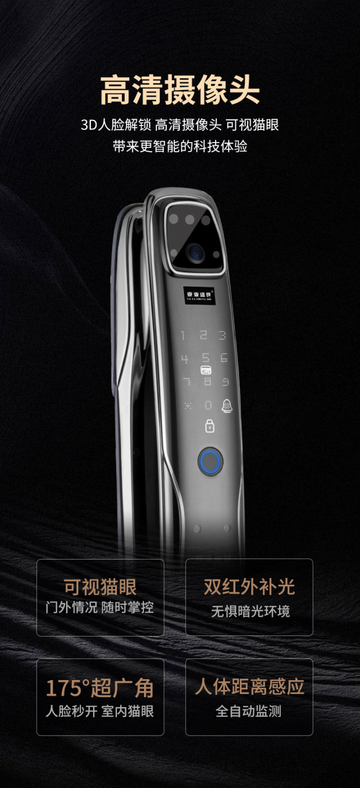 智能猫眼:175°大广角不用开门即可看到门外情况,并且24H不断监控门外实时情况,门锁自带人体传感器,自动识别来人,有人来送外卖和快递,可以及时抓拍,如果不在家还可以使用收集APP远程查看门外详情。